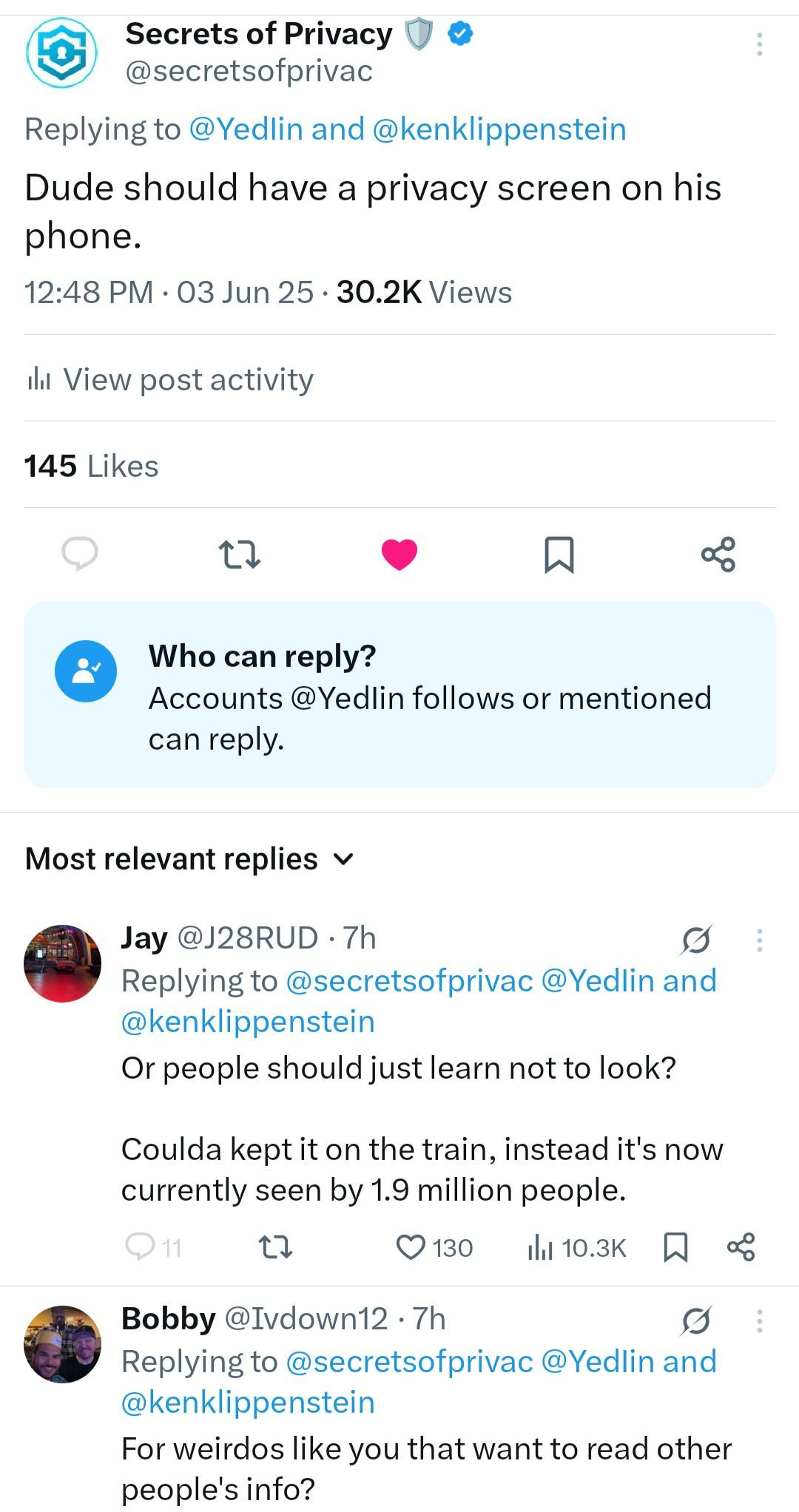 We jumped into the conversation on X about the viral photo, to try and steer things in a privacy focused direction. Specifically, we noted that the guy should of used a privacy screen. Seems obvious that would have saved him from being the laughingstock of the internet for the day.
