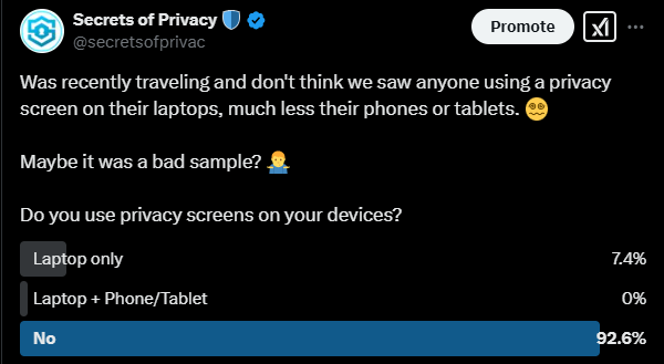 Recently, we ran a poll on the X, asking people if they use privacy screens on their laptop, mobile devices, or both. The results were a bit surprising:
