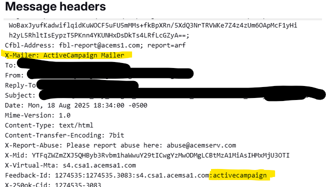 How did we find the info about ActiveCampaign? It was buried in the header details of the email. Here's a partial screenshot the reader shared.