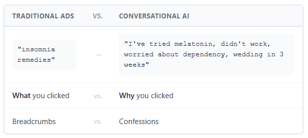 Conversational AI advertising works on confessions. You told ChatGPT you’re struggling with insomnia and asked for natural remedies. You explained your budget constraints and mentioned you’re skeptical of prescription drugs. That’s fundamentality different from the breadcrumb trail type tracking we’re all used to.