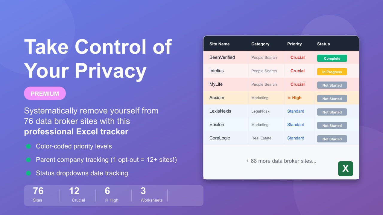 To help with that, we just released the Data Broker Opt-Out Tracker. It’s a formatted Excel workbook covering 76+ of the highest risk data broker sites. Best of all, it’s organized by parent company, priority tier, and what each opt-out actually requires.