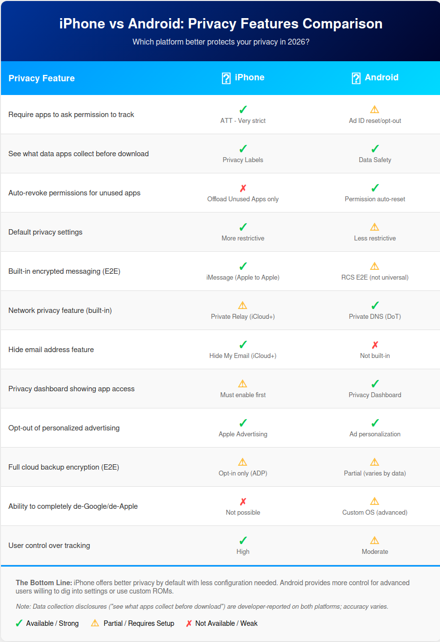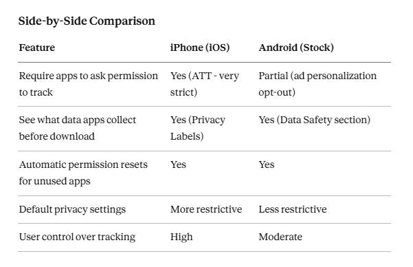 “The biggest factor: Your behavior matters more than your platform. An iPhone user who installs every app and accepts all permissions isn’t more private than an Android user who carefully manages their digital footprint.”