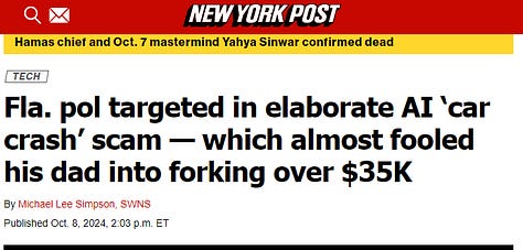 Fla. pol targeted in elaborate AI ‘car crash’ scam — which almost fooled his dad into forking over $35K (link)