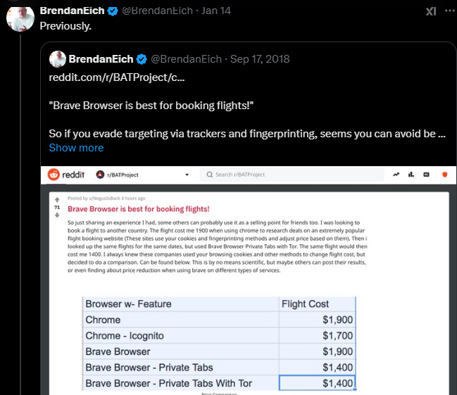 Even your choice of web browser and whether you're logged into an account can impact prices. Brave CEO Brendan Eich noted on X a post from Reddit from a few years back where a Redditor claimed that Brave browser offered the best pricing on airline flights.