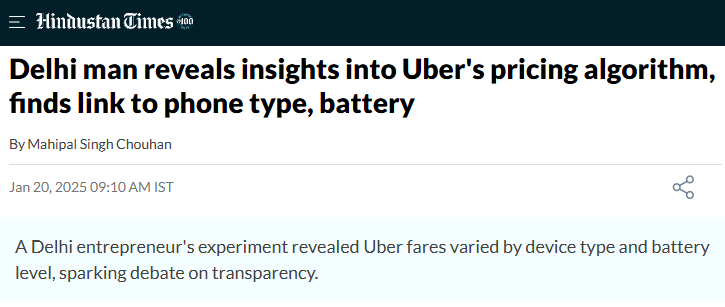 Your choice of phone or computer can also affect the prices you see. A recent controversy erupted when someone in India discovered Uber appeared to charge iPhone users more than Android users for identical rides. In this case, an Android user was quoted ₹290.79 for a ride while an iPhone user saw ₹342.47 for the exact same trip.