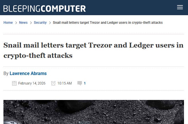 This time though, it’s wearing a logo you trust, like Amazon, or Ledger, or Trezor. And because we’ve spent twenty years being trained to distrust suspicious emails but almost no time learning to distrust suspicious mail, the scammers are stacking some wins.
