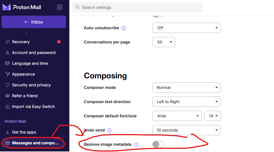 Proton Mail has a built-in feature that removes metadata from image attachments before you send them. There are no extra apps and no manual steps. Just flip a switch in your settings once and it handles the rest indefinitely.
