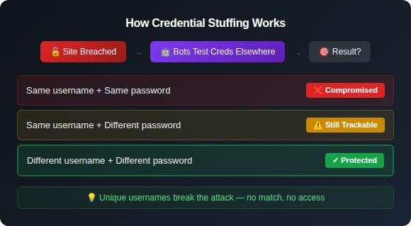 Credential stuffing is the immediate threat. But there’s a slower, more personal risk that comes from username reuse: you’re making yourself easy to track.