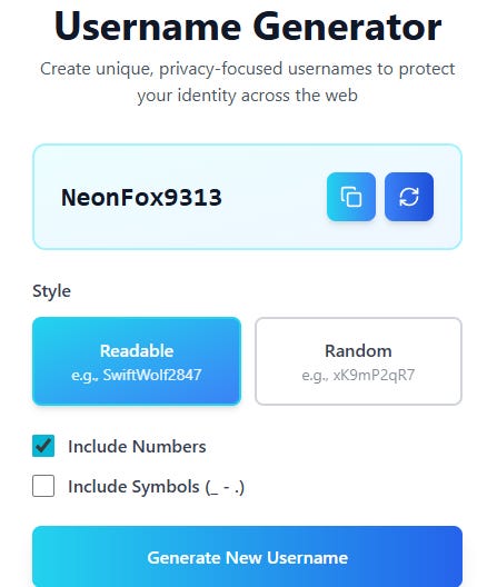 No tracking. No sign-up. Just a quick way to create usernames that don’t connect your accounts or make you a target.