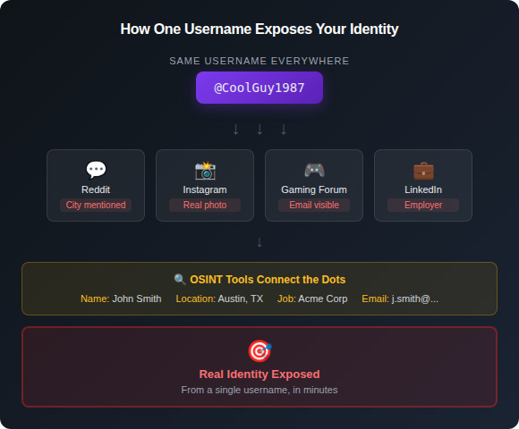 Reusing usernames creates two kinds of risk. The immediate one is credential stuffing attacks, which use stolen login pairs to break into your other accounts. The slower one is every shared username is a breadcrumb that connects your profiles across the internet, making it easy for doxxers, stalkers, or anyone with free OSINT tools to build a detailed picture of who you are. Unique usernames shut down both.