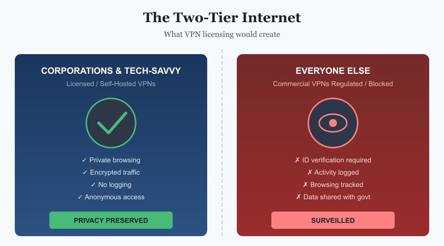 We’re already seeing hints of this. The UK government isn’t calling for an outright ban, they’re talking about “registration” and putting VPNs “in scope” of regulation. That’s licensing language.